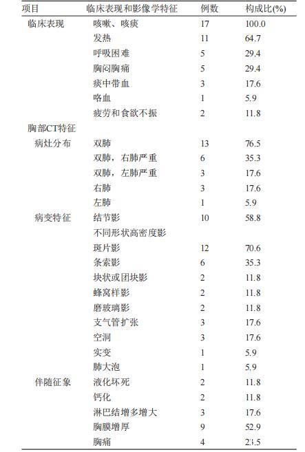 表2 17例肺諾卡菌感染患者的臨床癥狀和影像學(xué)特征