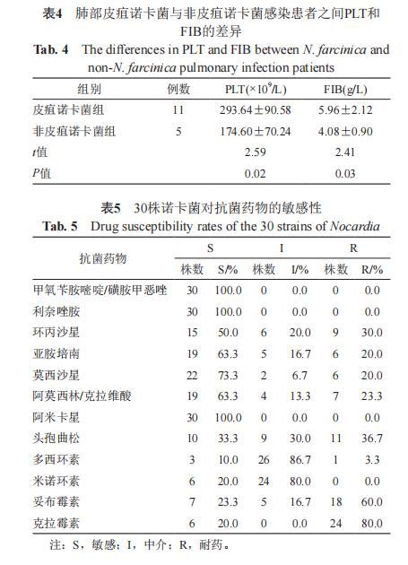 表4肺部皮疽諾卡菌與非皮疽諾卡菌感染患者之間PLT和FIB的差異