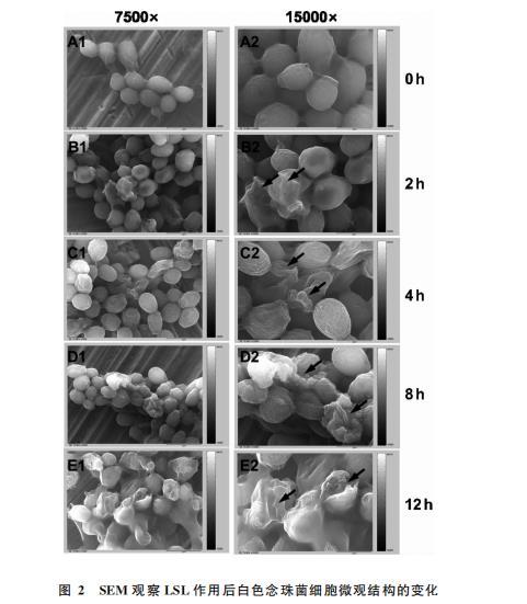 使用SEM觀察LSL處理不同時(shí)間后白色念珠菌細(xì)胞微觀結(jié)構(gòu)的變化。處理組取培養(yǎng)好的對(duì)數(shù)生長(zhǎng)期白色念珠菌菌液(菌濃已調(diào)整為1 x106CFU/mL),以2.0%(v/v)接種量將其接種到LSL濃度為MIC值的50mL液體培養(yǎng)基中,對(duì)照組取上述白色念珠菌菌液接種于等體積未添加LSL的液體培養(yǎng)基中。分別在培養(yǎng)2、4、8、12h時(shí)各取出3 mL培養(yǎng)物于6000r/min(離心半徑9.25cm)離心10 min收集菌泥,PBS溶液洗滌3次后使用2.5%戊二醛在4℃冰箱中固定12h,PBS溶液洗滌3次后離心并分別以乙醇梯度脫水(50%,70%,80%,90%,100%),真空條件下干燥,噴金,SEM觀察并拍照。