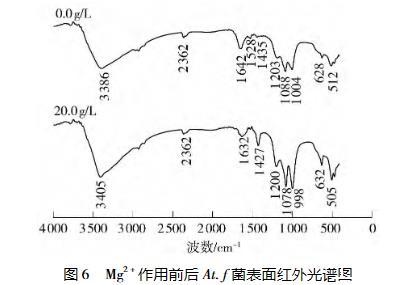 Mg2?作用前后的細(xì)菌經(jīng)冷凍干燥處理后可進(jìn)行紅外光譜掃描,通過(guò)對(duì)比作用前后細(xì)菌表面官能團(tuán)的變化情況,能夠定性得出Mg2?對(duì)細(xì)菌的作用。At.f菌在0.0、20.0 g/L Mg2?中培養(yǎng)后細(xì)菌表面的紅外光譜圖見(jiàn)圖6。