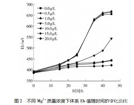 氧化還原電位能從整體上反映系統(tǒng)的氧化能力。不同質(zhì)量濃度Mg2?下At.f菌培養(yǎng)過(guò)程中Eh值隨時(shí)間的變化情況如圖2所示。