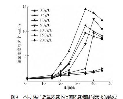 從圖4中可以看出:Mg2?質(zhì)量濃度≤1.0 g/L時(shí),細(xì)菌生長(zhǎng)速度快,達(dá)到對(duì)數(shù)生長(zhǎng)期的時(shí)間短,且隨著離子質(zhì)量濃度的增加,細(xì)菌濃度也增大,說(shuō)明適量的鎂離子能夠促進(jìn)細(xì)菌的生長(zhǎng);當(dāng)Mg2?質(zhì)量濃度超過(guò)1.0 g/L時(shí),細(xì)菌生長(zhǎng)受到抑制,延滯期增長(zhǎng),5.0、10.0 g/L Mg2?質(zhì)量濃度條件下,均在40 h才達(dá)到細(xì)菌生長(zhǎng)旺盛期,且Mg2?濃度越大,細(xì)菌濃度越低;當(dāng)Mg2?質(zhì)量濃度繼續(xù)增大到15.0、20.0 g/L時(shí),整個(gè)培養(yǎng)過(guò)程中,細(xì)菌濃度都偏低,說(shuō)明此時(shí)細(xì)菌生長(zhǎng)受到抑制。這是因?yàn)?,Mg2?質(zhì)量濃度過(guò)高導(dǎo)致細(xì)菌體內(nèi)與溶液之間的滲透壓增加,從而影響其正常的生理功能,或者影響其他物質(zhì)代謝過(guò)程的進(jìn)行,包括阻礙其他物質(zhì)進(jìn)入細(xì)胞、影響其他酶的代謝功能等,從而導(dǎo)致細(xì)菌的正常生長(zhǎng)受到抑制。