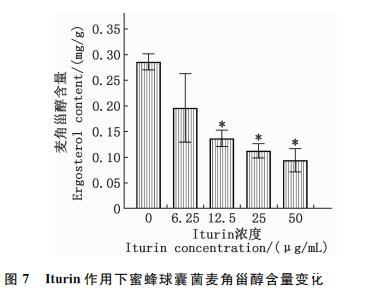 由圖7可知,隨著Iturin濃度的升高,麥角甾甾醇含量逐漸降低。與對(duì)照組相比,當(dāng)Iturin濃度為12.5、25和50μg/mL時(shí),麥角甾甾醇含量分別下降了52.18%、60.69%和67.12%,差異顯著(P<0.05)。
