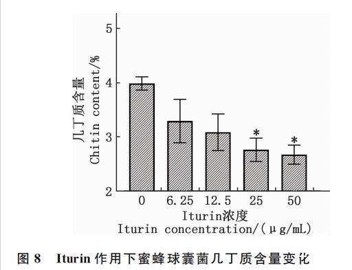 由圖8可知,與對(duì)照組相比,Iturin各濃度處理組幾丁質(zhì)含量分別下降了17.39%、22.58%、30.69%和32.94%,25和50μg/mL Iturin組幾丁質(zhì)含量顯著低于對(duì)照組(P<0.05)。