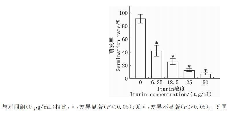 抑菌試驗(yàn)結(jié)果顯示,Iturin抑菌效果呈現(xiàn)明顯的濃度依賴(lài)性,3.13~25μg/mL范圍內(nèi)抑菌作用逐漸增強(qiáng),25μg/mL時(shí)達(dá)到最大效果。孢子萌發(fā)抑制試驗(yàn)證實(shí)其抑制率與濃度呈正相關(guān)(6.25~50μg/mL)。相比對(duì)其他病原菌的MIC值(鐮刀霉51.8μg/mL,灰葡萄孢霉37.0μg/mL),Iturin對(duì)蜜蜂球囊菌顯示出更強(qiáng)的抑制活性,表明其具有高效、廣譜的抗真菌特性。