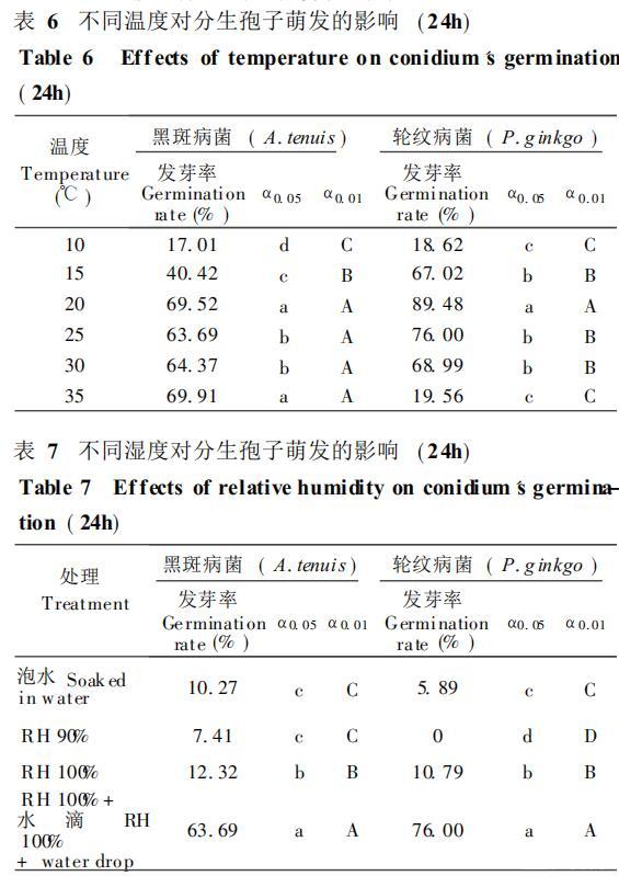 朱克恭研究認為銀杏葉枯病的病原菌中,黑斑病菌在6月~10月都有大量的出現(xiàn),而輪紋病在高溫季節(jié)很少出現(xiàn),僅在10月份才有所增加。本實驗得到相似的結果,輪紋病菌不能耐35℃的高溫,黑斑病菌耐高溫的能力強。2種菌在RH65%以上都生長好,適宜的相對濕度為75%~85%,試驗結果表明:相對濕度大有利于分生孢子形成;飽和濕度且有水滴的培養(yǎng)條件,分生孢子的發(fā)芽率最高。因此,在綜合防治中,清除銀杏果園內的雜草,降低地表面的相對濕度,可以在一定程度上減少侵染來源。泡水處理中,分生孢子的發(fā)芽率低,也許與缺氧有關。