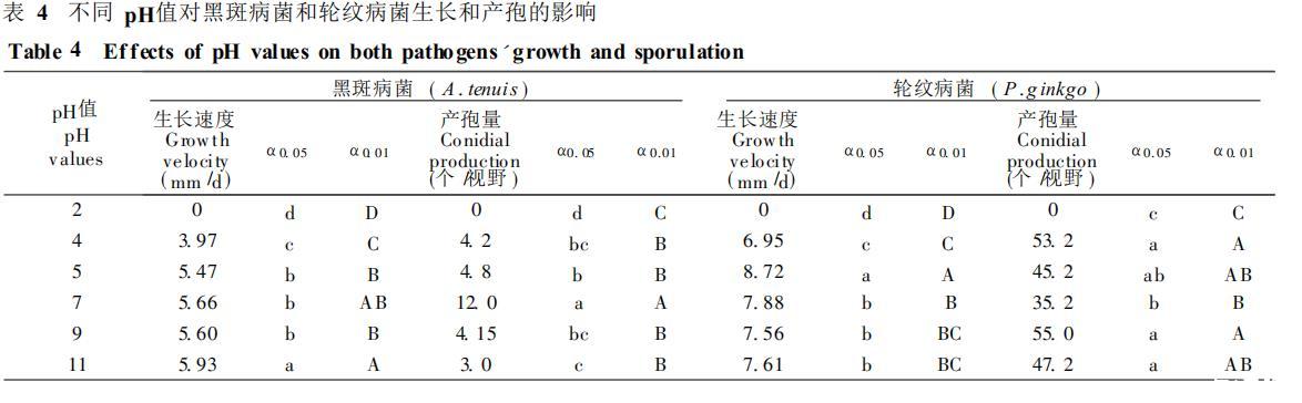 試驗結果(表4)表明,2種菌在pH值<2都不能生長,生長和產孢pH值范圍為4~11,并且以pH值5~11基質中生長為好。黑斑病菌在pH值為11的基質中生長快,但此時菌落稀疏,產孢量較少;pH值為7時,該菌生長速度僅次于pH值11,且菌絲濃密,產孢量最大;在pH值4~5和pH值9~11范圍內的產孢量沒有達到極顯著水平。輪紋病菌在pH值4~9基質中形成同心環(huán)型菌落,其中以pH值為5的基質上生長最好,氣生菌絲發(fā)達,菌落濃密,pH值為4和pH值為9的產孢量最大,兩處理間的產孢量沒有顯著性差異。