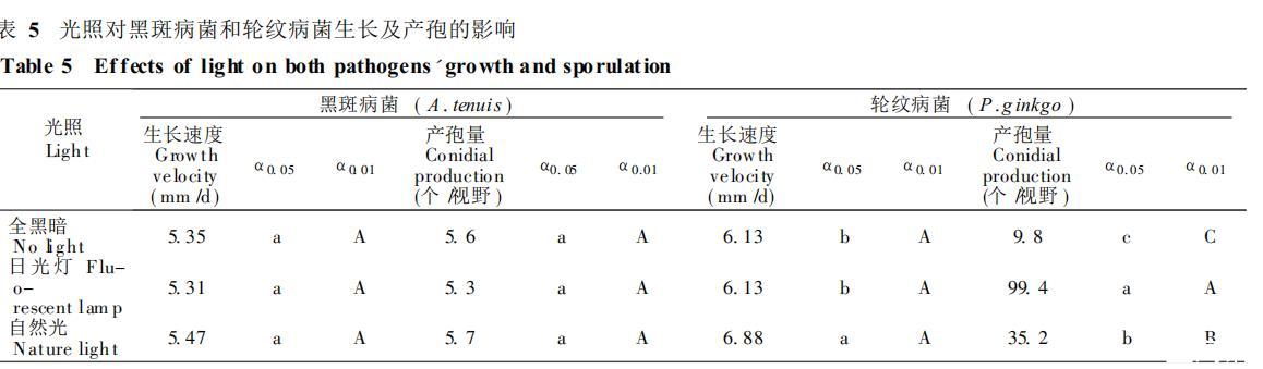 從表5可知,光照對黑斑病菌的生長、產孢,以及對輪紋病菌的生長都沒有顯著的影響。對于輪紋病菌,日光燈照射4d后開始形成分生孢子,自然光照射6d后形成少許分生孢子,全黑暗條件下8d開始形成分生孢子。由此可見,光照能促進輪紋病菌分生孢子的形成,且日光燈照射比自然光照射,產孢量多1倍以上。