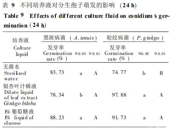 從表9可看出,黑斑病菌的分生孢子24h的發(fā)芽率在α?.??水平上沒有顯著性差異,說明該菌分生孢子萌發(fā)與培養(yǎng)液有無養(yǎng)分沒有顯著關系。而輪紋病菌的分生孢子在銀杏葉汁稀液和1%葡萄糖液中的萌發(fā)率高,且不存在顯著性差異;但與在無菌水中萌發(fā)比較就存在顯著性差異。