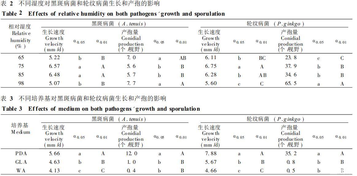 表2不同濕度對黑斑病菌和輪紋病菌生長和產孢的影響