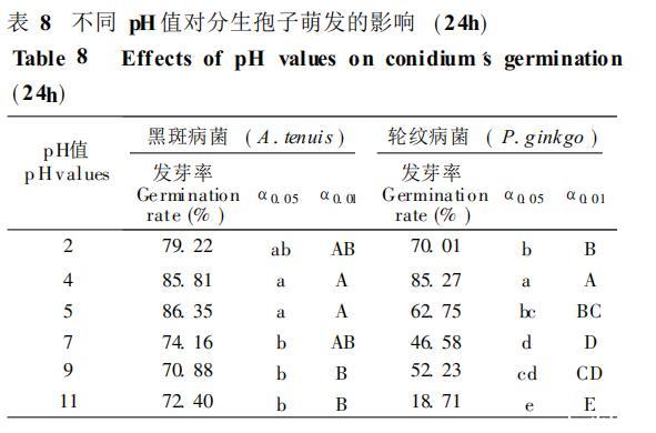 從表8可看出,2種菌的分生孢子在pH值2~11都能萌發(fā)。黑斑病菌的分生孢子萌發(fā)適宜pH值為2~7,最適pH值為4~5;輪紋病菌的孢子在pH值2~5范圍萌發(fā)較好,最適為pH值4。由此可見,偏酸性的環(huán)境有利于黑斑病菌和輪紋病菌的分生孢子萌發(fā),尤其是后者。