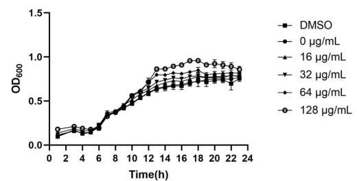 結果表明:在有效濃度范圍內(nèi)(16-128μg/mL),龍腦均不影響沙門氏菌SL1344的生長(見附圖)。