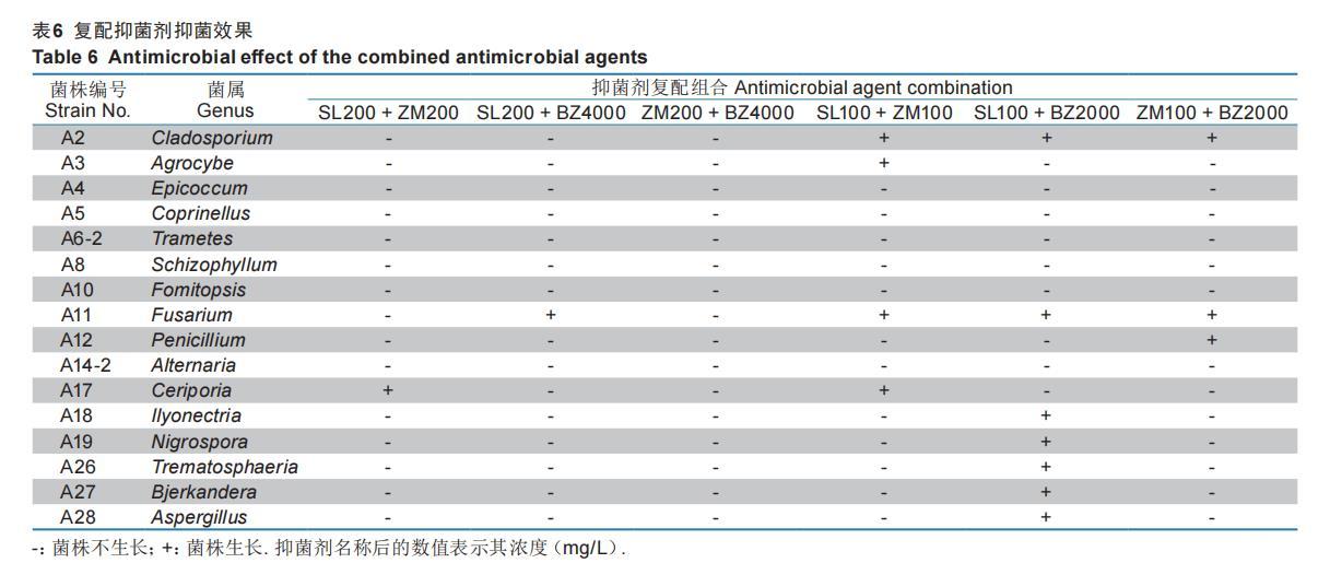 根據(jù)各抑菌劑對供試真菌的MIC值,采用二倍稀釋法配置復(fù)配抑菌劑,接種供試菌株于不同復(fù)配濃度的PDA平板,置于25°C恒溫培養(yǎng)5 d觀察各菌株生長狀況。結(jié)果表明,制霉菌素與苯扎氯銨分別按200 mg/L和4000 mg/L進行復(fù)配時,可完全抑制所有供試真菌的生長;而三氯生和制霉菌素的復(fù)配濃度均為200 mg/L時,除菌株A17不能抑制外,可抑制所有供試菌株的生長(表6)。