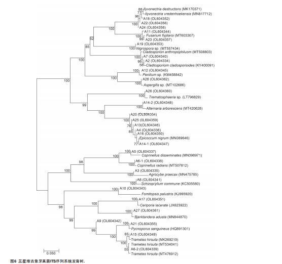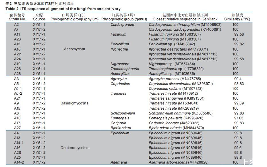 29株真菌經(jīng)ITS序列測定后,將序列提交至GenBank數(shù)據(jù)庫(登錄號OL604334-OL604362),并通過在NCBI上對測定序列進行blast比對分析,選取相似度最高的菌株,確定菌株屬、種(表2),構(gòu)建系統(tǒng)發(fā)育樹(圖6)結(jié)果顯示兩種古象牙殘片表面所分離獲得的可培養(yǎng)真菌并無明顯差別,但XY51-1殘片上的真菌種類相對豐富,且在XY51-2殘片上分離的真菌屬大部分在XY51-1殘片上皆有發(fā)現(xiàn),兩種古象牙殘片可培養(yǎng)真菌種類的差異可能與其出土?xí)r間有關(guān),XY51-1殘片相較于XY51-2殘片出土?xí)r間更晚,其暴露于環(huán)境中的時間更久,受環(huán)境中空氣、水分、溫度等的影響更大,這可能是導(dǎo)致其表面真菌種類更豐富的重要原因。從兩種古象牙殘片表面共分離出3個門16個屬的真菌,其中子囊菌門(Ascomycota)包含7個屬,分別為枝胞屬(Cladosporium)、鐮刀菌屬(Fusarium)、青霉屬(Penicillium)、土赤殼屬(Ilyonectria)、黑孢霉屬(Nigrospora)、黑陷球殼屬(Trematosphaeria)、曲霉菌屬(Aspergillus);擔(dān)子菌門(Basidiomycotina)包含7個屬,分別為田頭菇屬(Agrocybe)、鬼傘屬(Coprinellus)、栓菌屬(Trametes)、裂褶菌屬(Schizophyllum)、擬層孔菌屬(Fomitopsis)、蠟孔菌屬(Ceriporia)、煙管菌屬(Bjerkandera);半知菌門(Deuteromycetes)包含2個屬,為附球菌屬(Epicoccum)、鏈格孢屬(Alternaria)。