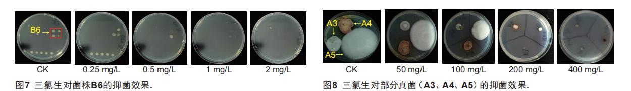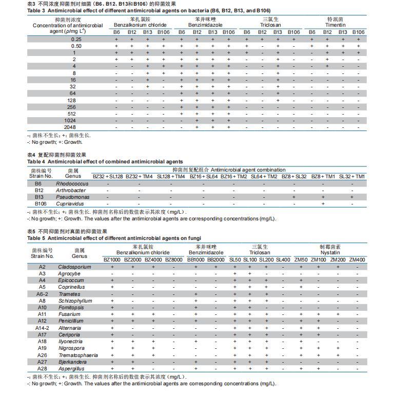 不同抑菌劑對各真菌的抑菌結(jié)果表明,苯并咪唑濃度達到2000 mg/L都不能完全抑制所有供試真菌的生長,抑菌效果最差。由于在試驗過程中還發(fā)現(xiàn)苯并咪唑的母液濃度為20500 mg/L左右時,基本已經(jīng)達到飽和濃度不能再提高,因此在后續(xù)復(fù)篩中不再使用。其余3種抑菌劑能夠完全抑制所有供試真菌生長的濃度分別為苯扎氯銨8000 mg/L,制霉菌素和三氯生均為400 mg/L(圖8),說明不同抑菌劑對真菌的抑菌效果存在較大差異(表5)。