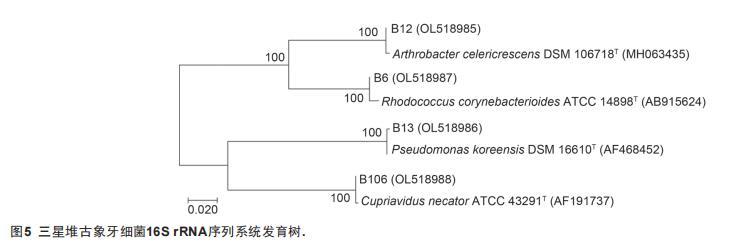4株細菌經(jīng)16S rRNA序列測定后,將序列提交至GenBank數(shù)據(jù)庫(登錄號OL518985-OL518988),并通過在NCBI上對測定序列進行BLAST比對分析,選取相似度最高的菌株,確定菌株屬、種,構(gòu)建系統(tǒng)發(fā)育樹(圖5)。結(jié)果表明古象牙表面分離獲得的4株可培養(yǎng)細菌分屬于紅球菌屬(Rhodococcus)、節(jié)桿菌屬(Arthrobacter)、假單胞屬(Pseudomonas)、貪銅菌屬(Cupriavidus)4個屬。