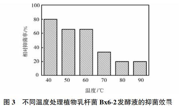 植物乳桿菌Bx6-2所產(chǎn)抑菌物質(zhì)的溫度穩(wěn)定性實驗結(jié)果如圖3所示。由圖3可知,植物乳桿菌Bx6-2所產(chǎn)的抑菌物質(zhì)對熱的穩(wěn)定性較好,在60℃水浴中加熱10min后,相對抑菌活性仍在65%以上。然而,當處理溫度在60℃以上時,其抑菌效果明顯下降。