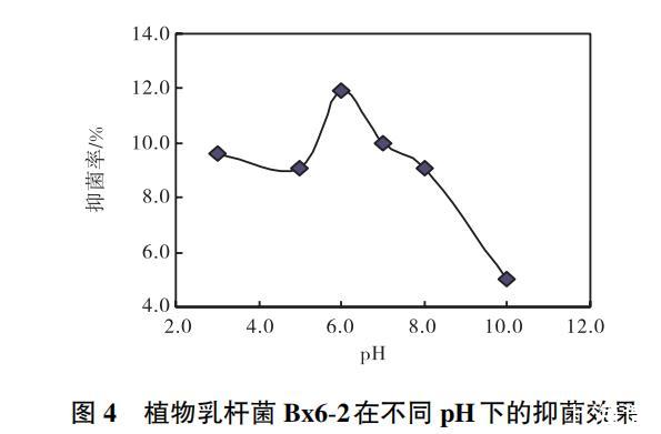 植物乳桿菌Bx6-2的發(fā)酵液在不同的pH下,其抑菌效果也各不相同(圖4)。當pH6.0時,抑菌效果達到最好,在過酸和堿性環(huán)境中其抑菌效果明顯降低。因此,在發(fā)酵液中活性物質(zhì)分離純化和使用過程中應保持在pH6.0的弱酸性環(huán)境。