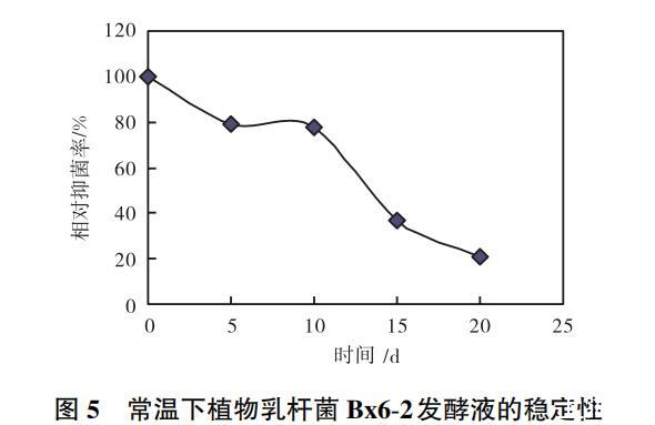 由圖5可以看出,隨著時間的增加,植物乳桿菌Bx6-2的抑菌活性有不同程度的下降。在常溫下放置10d后,植物乳桿菌Bx6-2發(fā)酵液的抑菌活性仍保留在70%以上。放置15d以上,抑菌活性明顯下降,僅能達到原抑菌活性的20%左右。由此可見,植物乳桿菌Bx6-2產(chǎn)生的抑菌物質(zhì)在常溫下一定時間范圍內(nèi)穩(wěn)定性較好。