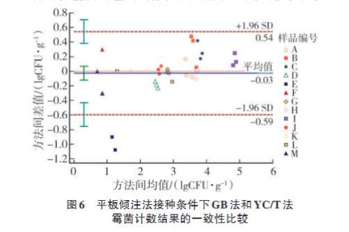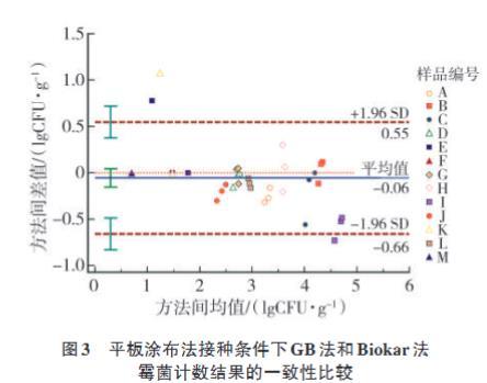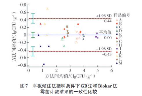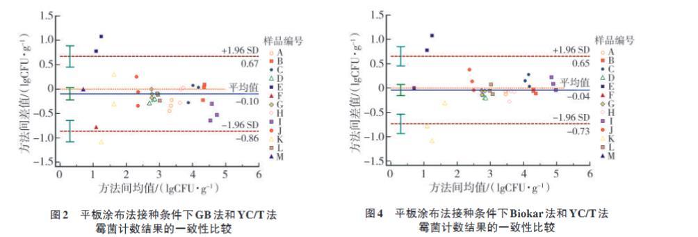 對(duì)3種培養(yǎng)基平板涂布法霉菌計(jì)數(shù)結(jié)果分別進(jìn)行Bland-Altman圖比較,如圖2,圖3和圖4所示。將GB法-TB,Biokar法-TB和YC/T法-TB進(jìn)行比較,發(fā)現(xiàn)除低濃度樣本中的個(gè)別數(shù)據(jù)分布在95%上下限之外,其余樣本占比分別為92.31%,92.31%和89.74%的數(shù)據(jù)點(diǎn)落在95%上下限內(nèi),說(shuō)明3種方法間檢測(cè)結(jié)果一致性較好。當(dāng)樣品中霉菌含量低于102CFU/g時(shí),培養(yǎng)基對(duì)霉菌計(jì)數(shù)結(jié)果的影響較大,而當(dāng)樣品中霉菌含量高于102CFU/g時(shí),培養(yǎng)基對(duì)霉菌計(jì)數(shù)結(jié)果的一致性較好。表明3種培養(yǎng)基采用平板涂布法進(jìn)行接種,對(duì)霉菌計(jì)數(shù)結(jié)果的影響與樣品中霉菌含量有關(guān)。
