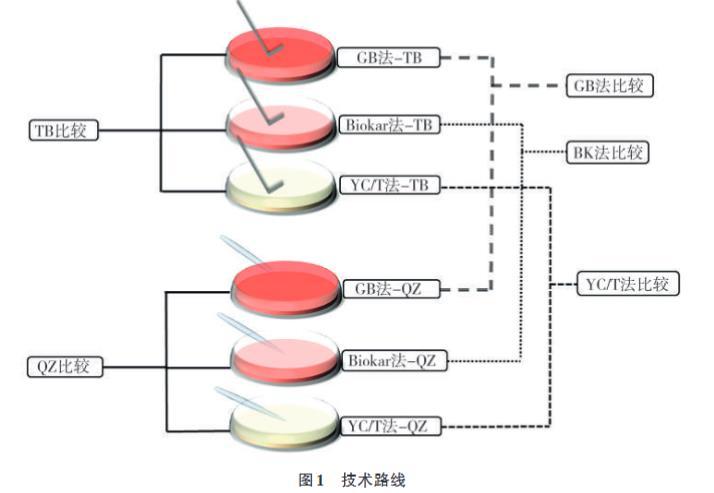 平板涂布法(TB):吸取各樣品的梯度稀釋液于各培養(yǎng)基表面(每個(gè)稀釋度分別吸取0.333 mL接種量并分別加入到3塊已提前制備好的培養(yǎng)基平板中),后用一次性無(wú)菌L型涂布棒涂抹均勻,待培養(yǎng)基表面水分晾干后密封進(jìn)行正置培養(yǎng),培養(yǎng)及計(jì)數(shù)方法與平板傾注法相同。具體技術(shù)路線及方法簡(jiǎn)稱如圖1所示。