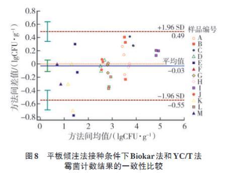 對(duì)3種培養(yǎng)基的平板傾注法進(jìn)行分析,結(jié)果如圖6,圖7和圖8所示。從Bland-Altman圖中發(fā)現(xiàn),94.87%的數(shù)據(jù)點(diǎn)均落在95%上下限內(nèi),表明3種培養(yǎng)基的平板傾注法結(jié)果一致性較好。檢測(cè)樣品中霉菌含量低于102CFU/g時(shí),3種培養(yǎng)基在平板傾注法接種條件下與平板涂布法接種條件下表現(xiàn)出的霉菌計(jì)數(shù)結(jié)果一致。說(shuō)明無(wú)論采用平板傾注法還是平板涂布法接種,當(dāng)樣品中霉菌含量低于102CFU/g時(shí),各培養(yǎng)基所對(duì)應(yīng)的計(jì)數(shù)方法均存在一定的波動(dòng)性。