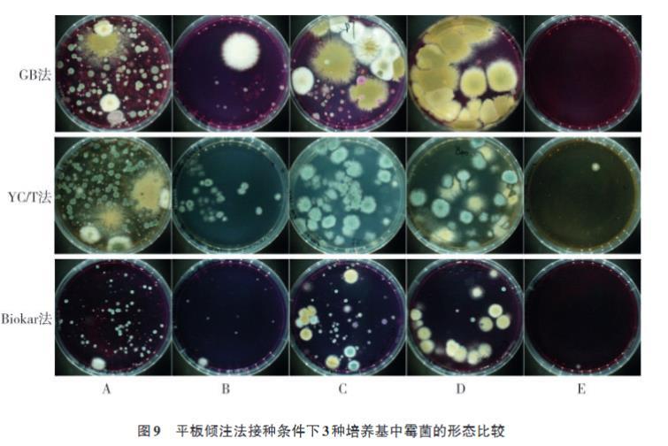 如圖5所示,通過(guò)對(duì)A,B,C,D,E等5個(gè)樣品的菌落形態(tài)觀察發(fā)現(xiàn),3種培養(yǎng)基采用平板涂布法接種培養(yǎng)后樣品中典型霉菌菌落形態(tài)區(qū)別較大,其中GB法與YC/T法霉菌菌落較大,形態(tài)清晰易判讀。Biokar法典型菌落較小,分布均勻,更有助于計(jì)數(shù),但較難從菌落形態(tài)上區(qū)分出不同種類的霉菌,由此推測(cè)Biokar法所用SYMPHONY Agar快速顯色培養(yǎng)基中生長(zhǎng)促進(jìn)劑和選擇性系統(tǒng)既可以促進(jìn)霉菌的快速生長(zhǎng)又能抑制霉菌菌絲的過(guò)度繁殖。綜合比較發(fā)現(xiàn),平板涂布法接種培養(yǎng)基上霉菌菌落全部生長(zhǎng)于培養(yǎng)基表面,GB法與YC/T法的典型霉菌菌落形態(tài)最易判別,而B(niǎo)iokar法更易快速計(jì)數(shù)。