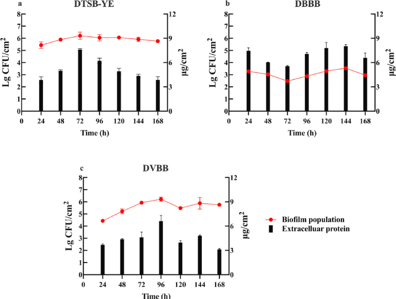 圖5.25°C時ST87生物膜中活細胞計數(shù)和細胞外蛋白含量的趨勢。