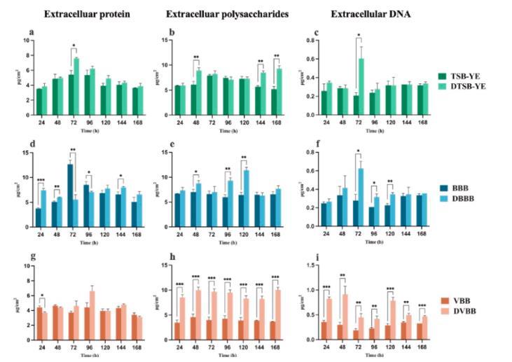 圖4.測定在25°C下在不同營養(yǎng)條件下形成的生物膜中ST87細胞外物質(zhì)含量。注:a、d、g代表細胞外蛋白含量測定,b、e、h代表細胞外多糖含量測定,c、f、i代表細胞外DNA含量測定,a-c代表不同濃度TSB-YE下形成的生物膜,d-f代表不同濃度牛湯下形成的生物膜,g-i代表不同濃度蔬菜汁下形成的生物膜。