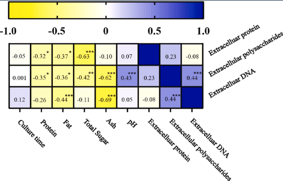 圖6.25°C下ST87生物膜中的細胞外物質(zhì)與生長培養(yǎng)基中的營養(yǎng)成分之間的Spearman相關系數(shù)熱圖,以及培養(yǎng)時間。