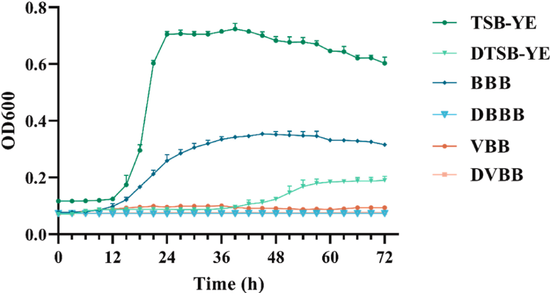將制備的兩種單核細胞增生李斯特菌株的生物量分別加入到各培養(yǎng)基(TSB-YE、DTSB-YE、BBB、DBBB、VBB和DVBB)中,比例為1:10,使單核細胞增生李斯特菌密度約為103CFU/毫升。將每組接種的培養(yǎng)液的體積為200μL,一式三份分配到100孔蜂窩®微孔板的孔中。使用Bioscreen C(Oy Growth Curves Ab Ltd.,Helsinki,F(xiàn)inland)在25°C下以中等強度連續(xù)振蕩72小時,并在600nm波長(OD 600)OD下測量光密度600每2小時測量一次。將每種無菌培養(yǎng)物作為對照納入并用于校正OD600值。該實驗是用兩個獨立的生物學重復進行的,每個重復在三個技術上平行。