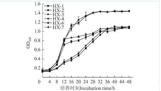 由供試NS菌株在YPD液體培養(yǎng)基中的生長曲線(圖1)可知,同一種屬菌株表現(xiàn)出相似的生長趨勢,而不同種屬間的生長情況有一定差異。其中T.delbrueckii菌株(HX-6、HX-7)在經(jīng)歷4 h延滯期后迅速進(jìn)入對(duì)數(shù)生長期,28 h左右達(dá)到穩(wěn)定期,最終OD600值達(dá)到1.4左右,生長速度和光密度值明顯高于其他菌株;H.uvarum菌株(HX-1、HX-3)同樣經(jīng)歷4 h延滯期后,在8~12 h期間生長速度較快、12~32 h期間生長較為緩慢并逐步達(dá)到穩(wěn)定期;M.pulcherrima菌株(HX-2、HX-4)對(duì)數(shù)生長期持續(xù)時(shí)間較長,40 h左右達(dá)到穩(wěn)定期,最大OD600值為1.102與1.098。
