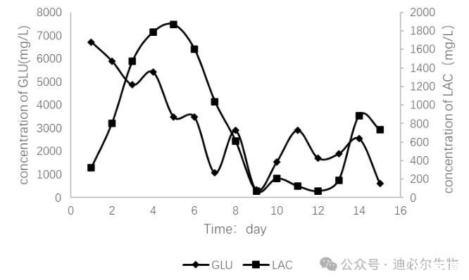 本次實驗中,培養(yǎng)周期內(nèi)細(xì)胞的生長曲線及活率變化曲線如圖1所示。培養(yǎng)過程中細(xì)胞前期快速生長,最高細(xì)胞密度達(dá)1.88×107cells/mL,同時細(xì)胞活率維持在95%-100%之間,至第15天結(jié)束批次時細(xì)胞活率降至82%。葡萄糖及乳酸代謝曲線如圖2所示,在培養(yǎng)過程中葡萄糖快速消耗,乳酸先累積再消耗。