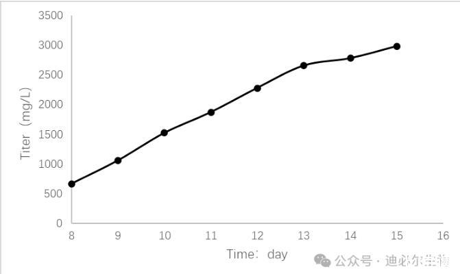 抗體表達(dá)量是抗體工藝中的關(guān)鍵目標(biāo)參數(shù)之一,對于抗體工藝的建立與優(yōu)化具有重要指導(dǎo)作用。在實驗進(jìn)行至第8天時,進(jìn)行蛋白表達(dá)量的相關(guān)檢測,并記錄表達(dá)量(圖3)。第8天至第15天,抗體產(chǎn)量逐漸增加,在第15天時表達(dá)量達(dá)到2.98g/L,表明在一次性細(xì)胞罐Endura SUB®3L中CHO-K1細(xì)胞同樣能夠正常完成相關(guān)抗體蛋白的合成。