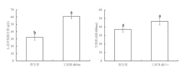通過(guò)以上步驟,使用經(jīng)過(guò)改造后的重組大腸桿菌相比于野生型能夠更好地利用葡萄糖等碳源物質(zhì)進(jìn)行L-高絲氨酸的生產(chǎn),并且能力更強(qiáng),轉(zhuǎn)化率更高;請(qǐng)參閱圖2所示,經(jīng)過(guò)改造后得到的性能最優(yōu)的菌株在發(fā)酵生產(chǎn)L-高絲氨酸方面的水平相比于野生型有明顯提升,5L罐發(fā)酵水平從32.17g/L提升至60.87g/L,產(chǎn)率提高了89.21%,并且由工程菌dh5aα的發(fā)酵生長(zhǎng)曲線可知,在發(fā)酵32h后L-高絲氨酸產(chǎn)量最大,發(fā)酵產(chǎn)生的L-高絲氨酸的產(chǎn)量相較于通常情況下,生產(chǎn)效率更高,具有良好的應(yīng)用推廣價(jià)值;
