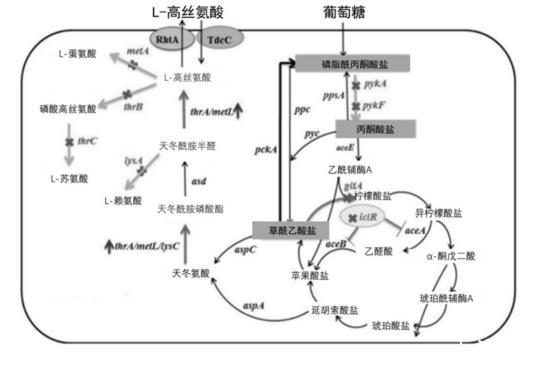 通過(guò)過(guò)表達(dá)thrAC1034T(thrA*)和lysCcg C932T(lysC*)基因,thrA*編碼抗反饋抑制的天冬氨酸激酶Ⅲ和高絲氨酸脫氫酶Ⅰ融合蛋白,lysC*編碼抗反饋抑制的天冬氨酸激酶Ⅰ,thrA*和lysC*的過(guò)表達(dá)將提高產(chǎn)物的合成速率,能減少草酰乙酸、檸檬酸等副產(chǎn)物的積累;